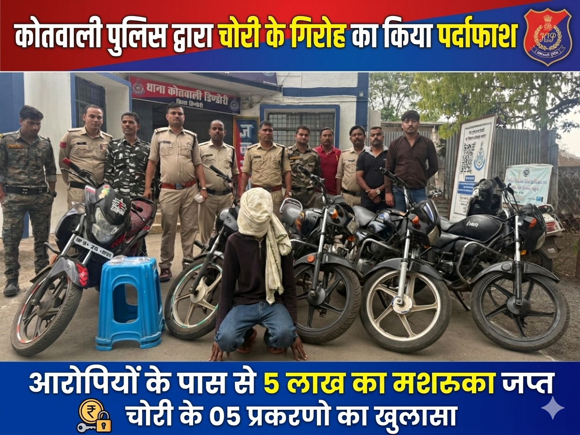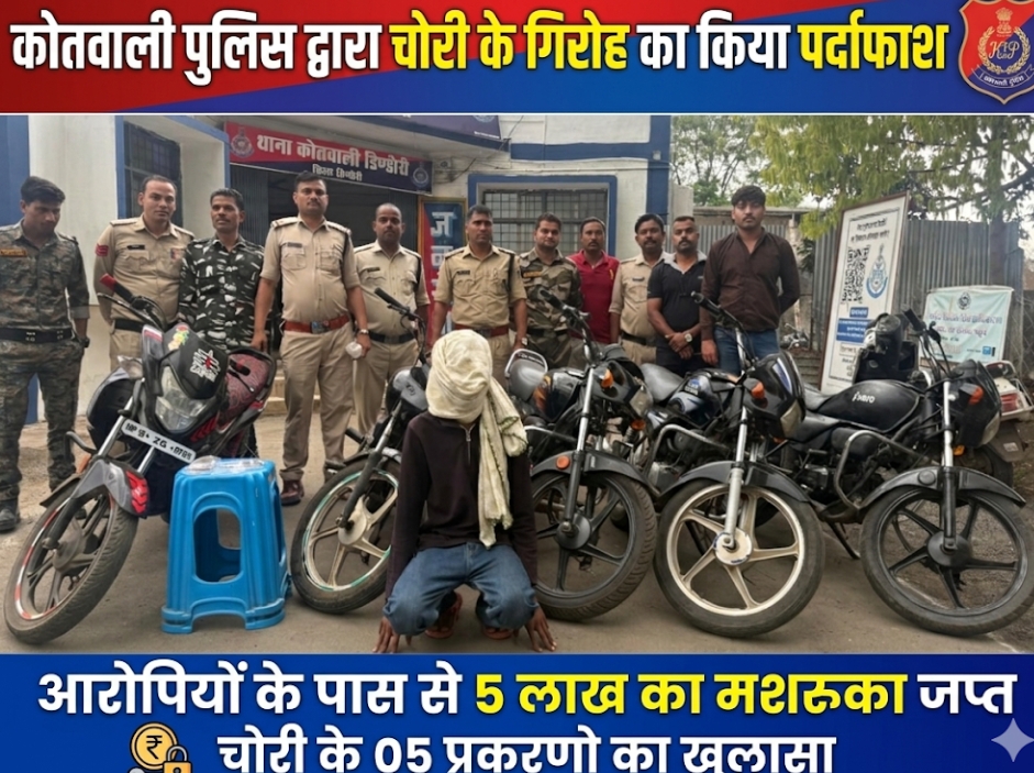 कोतवाली पुलिस द्वारा चोरी के गिरोह का किया पर्दाफाश,आरोपियों के पास से 5 लाख का मशरुका जप्त
